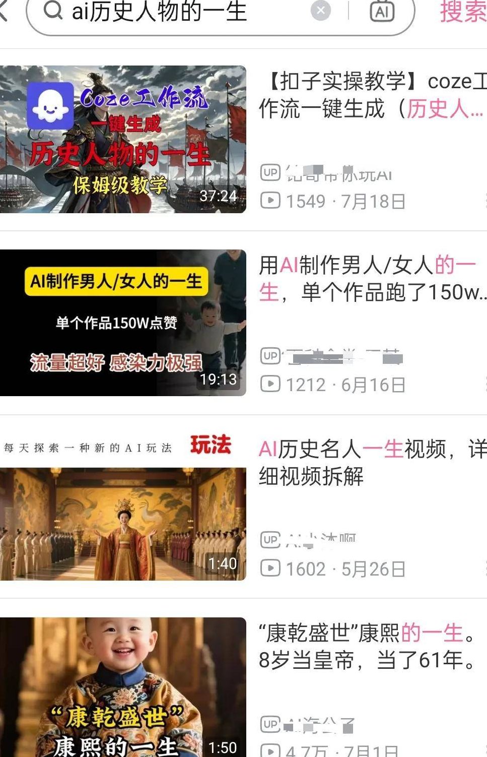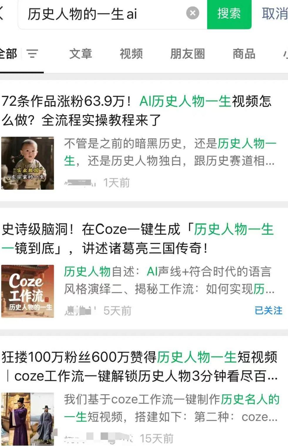 为精准定位对标账号,可借助微信“搜一搜”功能。以“历史人物的一生AI”这一具体玩法为关键词检索,系统会返回大量与该主题相关的优质公众号。这些账号可作为初期模仿与学习的对象。