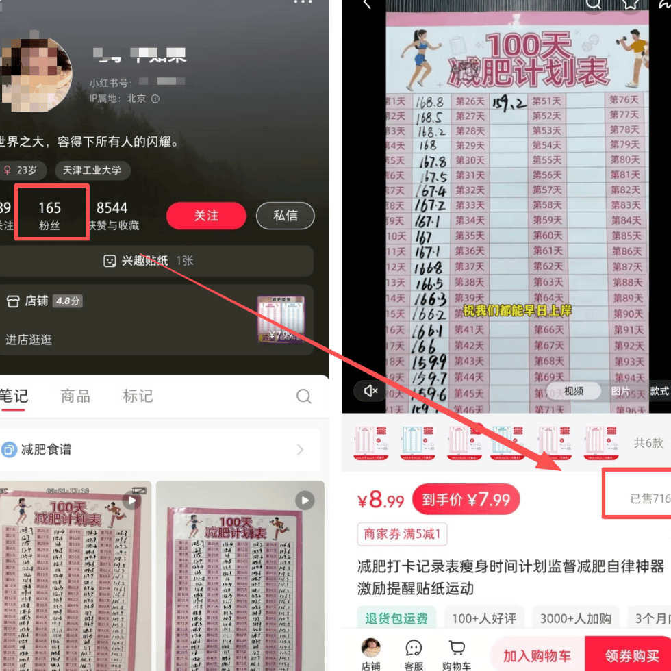 小红书靠减肥计划表贴纸变现:165粉丝卖7162单赚5万多,还能后端二次转化