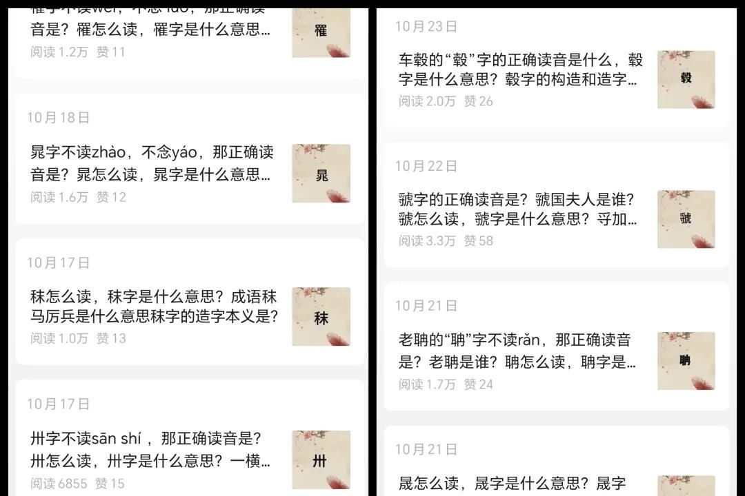 我们可以看到,生僻字赛道的流量非常稳定,单篇阅读几乎都在1000-10万+的区间内