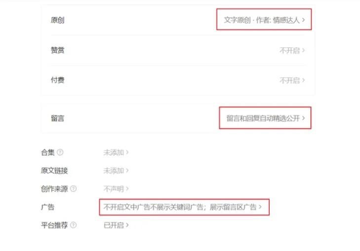 你只需滑到文章底部,开启原创声明、开启留言功能、勾选底部广告。