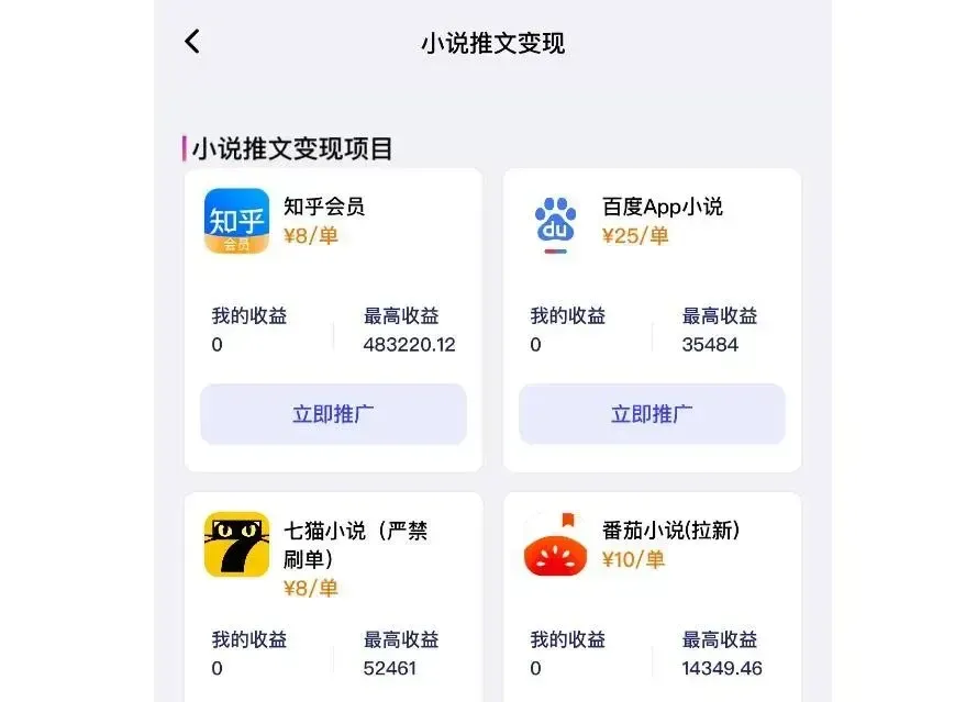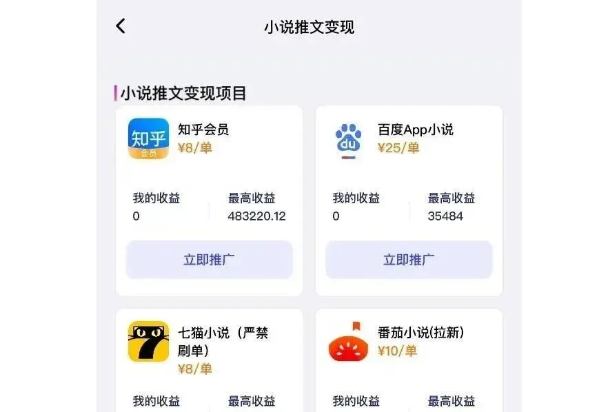 该平台包含大量小说推文、短剧推广、夸克网盘等赚钱任务,且任务单价较高。