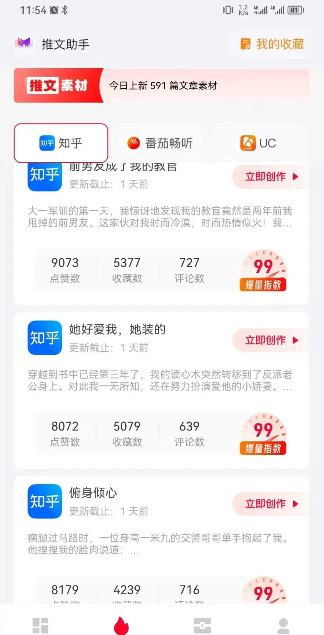 获取授权后,可寻找小说素材。素材来源包括:知乎、番茄、起点等小说平台,选择热度高、内容有趣的作品;也可借助推文工具查找近期爆款作品。