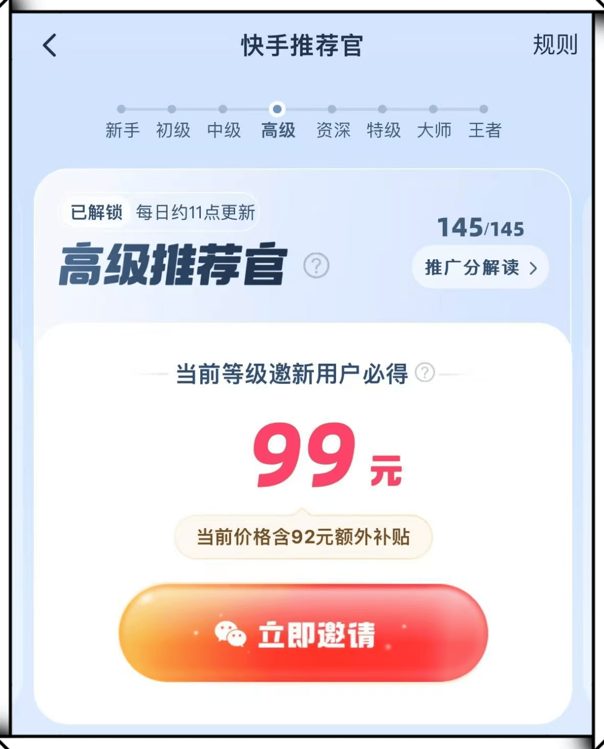 快手极速版推出了推荐官拉新活动,宣称邀请一名新用户可得99元现金奖励,虽然看似十分诱人,但实际收益与用户等级挂钩,设有一定限制与门槛。99元佣金包含92元额外补贴,这并非人人都能拿到,新手小白最终到手可能只有7元。