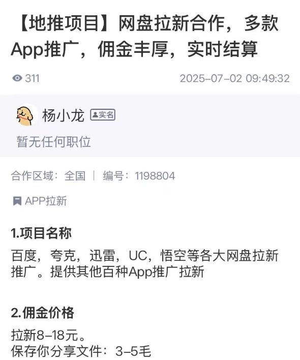 网盘拉新,就是通过网络推广的形式,帮助网盘获取新用户增量,从而拿到网盘应用方提供的推广佣金。