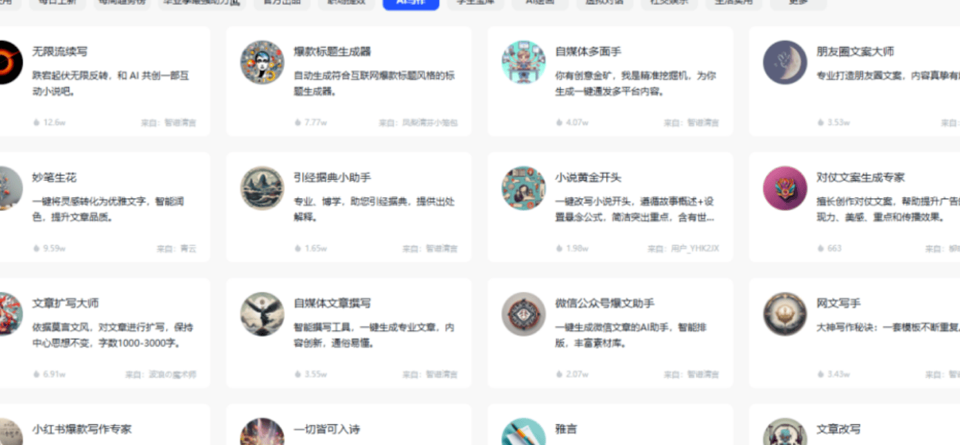 智谱清言有个特别厉害的功能,就是直接为用户集成了“智能体”,这些智能体可以帮你轻松梳理并生成需求,不管是文案创作、职场所需内容,还是生活里的创意构思、虚拟对话,甚至是代码指令,各类需求都能覆盖到,完全不用自己费心琢磨复杂的提示词。