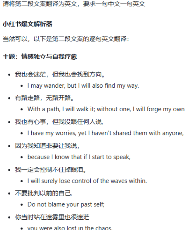 用这个智能体生成的几段文案,仿写效果都很棒,读起来一点不生硬,比用KIMI生成的结果要自然得多,完全能满足治愈类图文的创作需求。这里要提醒大家,生成后记得确认文案是中文的,确保用户能顺畅阅读。