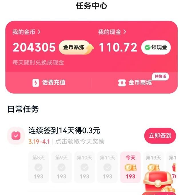 快手极速版的金币任务更为丰富,且常与各类游戏、活动相结合,具体包括签到、看广告、刷视频、开宝箱看广告、观看直播、搜索、走路赚钱、互动、邀请新用户等。金币兑换规则及收益提现方式与抖音极速版大致相同。