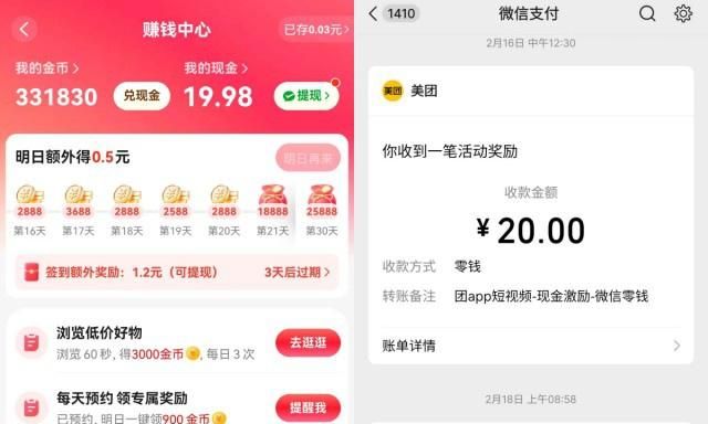 其赚钱中心内均为浏览美团各板块的任务,核心是将短视频与本地生活服务结合,以此增加用户转化路径。