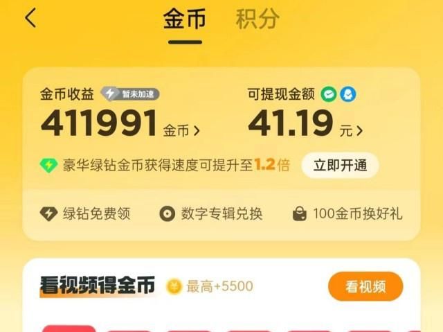 在金币专区内,用户看广告、听歌、听有声书均可获得金币,金币与收益的兑换比例为10000:1。单纯听歌任务的收益较低,建议大家可开启后台播放音乐,同时观看广告,以此获得双重收益。
