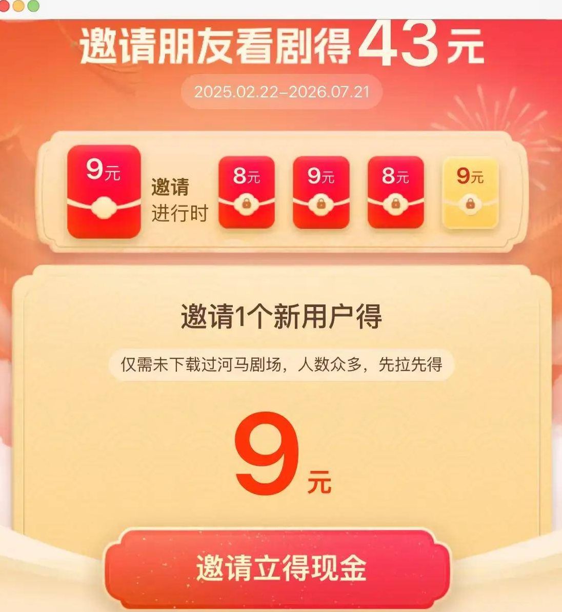 就是这个“邀请朋友看剧得43元”的活动,只要你邀请的好友完成指定的看剧时长,就能拿到8-9元的推广佣金。