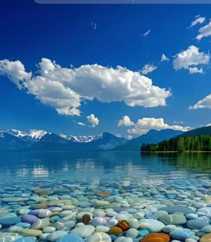 描述词3:两条金鱼在湖底灵活穿梭,周围散落着彩色石子作为点缀,镜头缓缓拉远展现整片湖景,画面色调明快鲜亮,整体氛围清新治愈。**