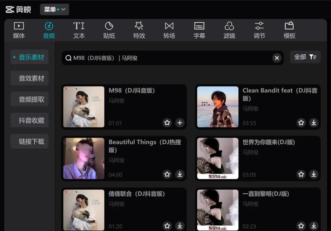 打开剪映APP,在音频素材库中搜索《M98》,找到后点击收藏以便后续使用。