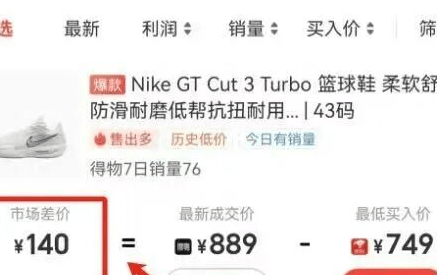 下面这款球鞋,在天猫购买只需1399元,而在得物上最新成交价为1919元,差价520元,这就是我们的机会。