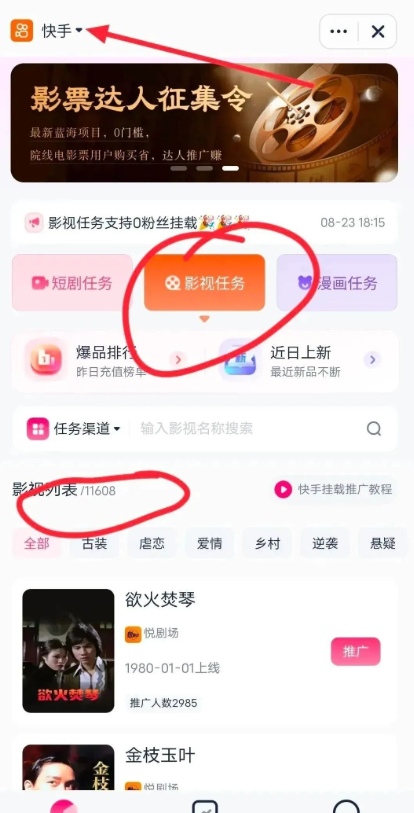 - 选择平台:进入影视推广页面,选择要发布的平台(如抖音、快手)。