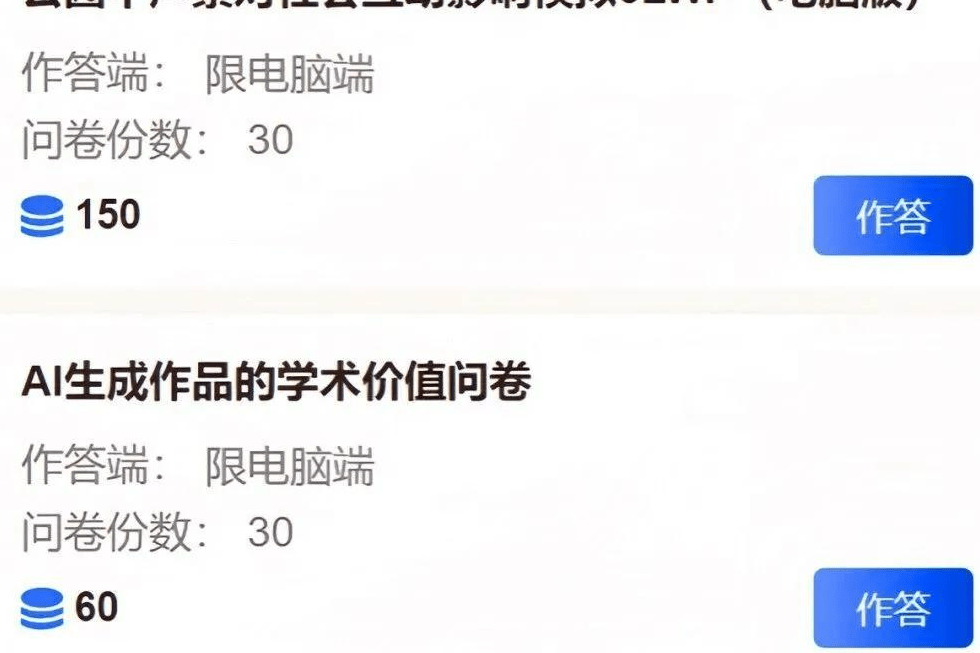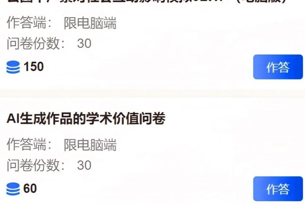 :“公园中声景对社会互动影响模拟”(电脑端,佣金约6元)、“AI生成作品的学术价值问卷”(电脑端,佣金约8元);