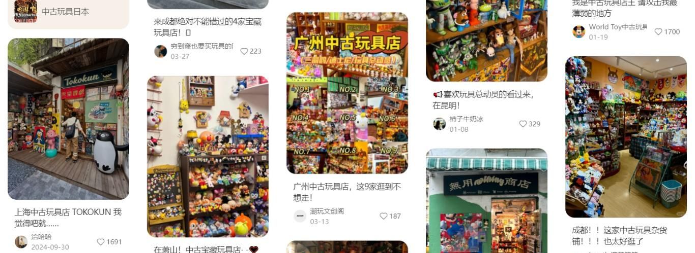 确定方向后,我没急着立刻闷头行动,而是花了两周时间做调研,我在抖音、小红书、闲鱼上搜“中古玩具”“古董玩具”这类关键词,找到了50个经营得不错的同行。