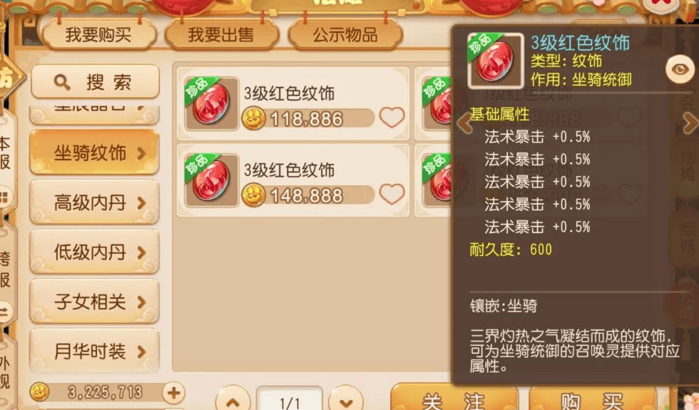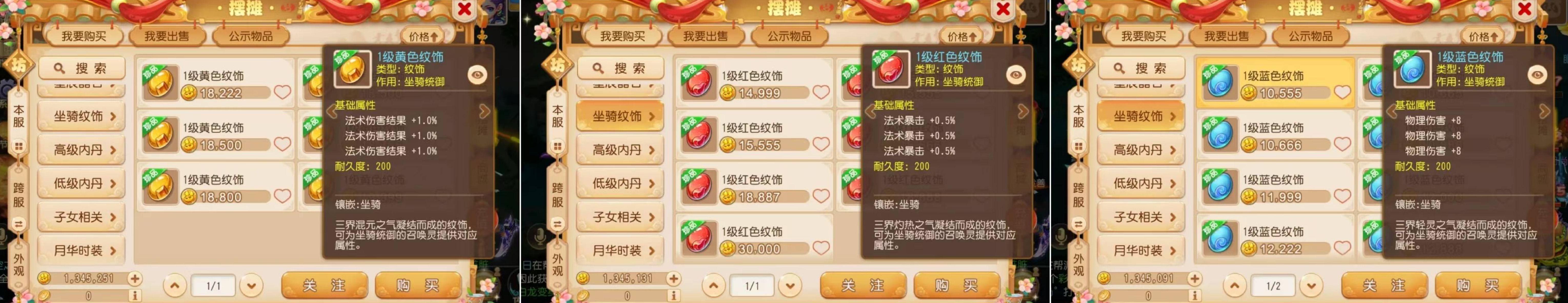 带有2-3个相同伤害类属性的纹饰,在市场上的价值相对更高,尤其是拥有3条物理伤害、法术伤害,或是3条物理暴击、法术暴击属性的纹饰。在这些高价值纹饰里,法系纹饰的价位是最高的;除此之外,蓝色纹饰中带有3条气血属性的品类,同样价格不菲。