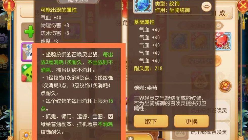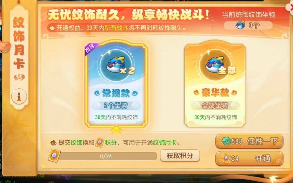纹饰月卡的开通需要花费58元人民币,或是24个纹饰积分,有效期仅为1个月,比较适合那些常年使用三级极品纹饰的氪金玩家——这类玩家经常参与各类PK活动,纹饰的耐久消耗速度极快。因为纹饰本身存在耐久度设定,所以它注定会持续被消耗。再加上帮派贸易、纹饰积分兑换、助战升级(该场景无法使用赠送的绑定纹饰)这些日常需求的加持,老区的纹饰价格一直处于居高不下的状态。其实,对于只做简单日常任务的搬砖党来说,老周还是建议大家佩戴坐骑纹饰。大部分日常任务,比如普通副本、抓鬼等,都不会消耗纹饰的耐久度;日常任务里,只有秘境和侠士副本会产生纹饰耐久消耗。一组纹饰,足够我们搬砖党使用很长一段时间了。
