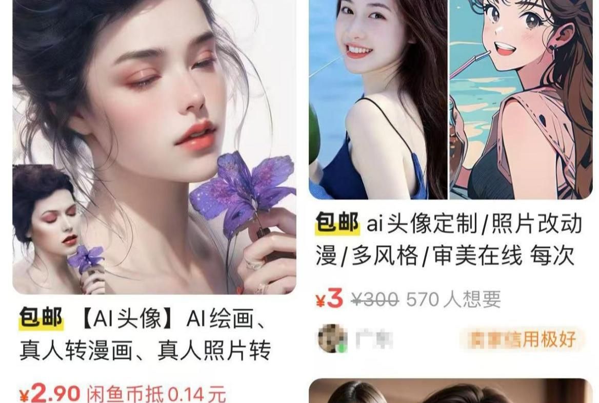 打开闲鱼就能发现,平台上有不少商家直接标注了AI定制头像的收费服务。和传统手绘服务相比,AI绘图的收费普遍低很多,但如果你能训练出没有“AI感”的特色图像模型,完全可以把收费抬上去。