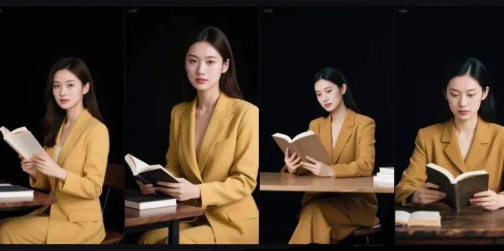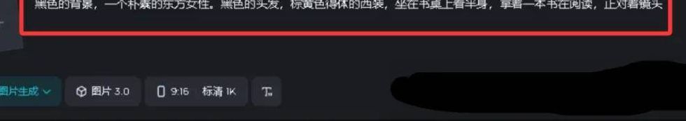 第四步,一键生成数字人视频。还是用「即梦AI」,输入一句话描述你想要的主角形象,比如「黑色背景,一位质朴的东方女性,黑头发,穿棕黄色西装,坐在书桌前看书,面向镜头」,对应的视频主角立马就生成了。
