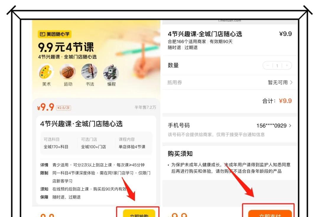 用户通过美团APP或微信扫描推广二维码,支付9.9元购买试听课。