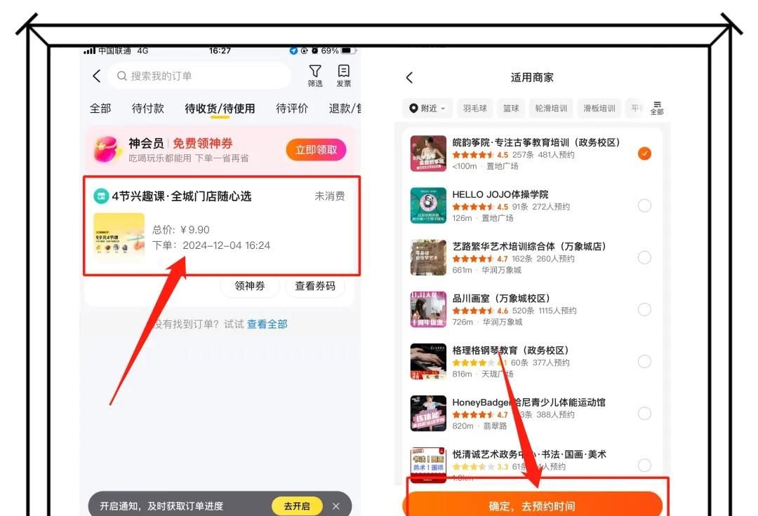 用户打开【美团APP】预约试听课时间:点击【我的】>【待使用订单】>【预约上课】。
