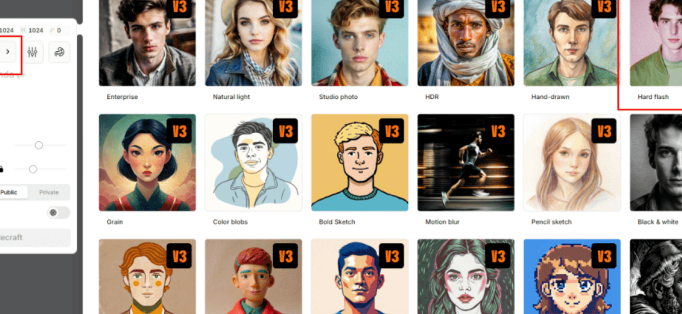 第二步,开始制作图片:先点击“图片”选项,进入后默认是“Recraft v3 Raw”,点击这个滤镜选项,选择“hard flash”或者“photorealism”滤镜,这两个滤镜做出来的“疯感”效果最到位。