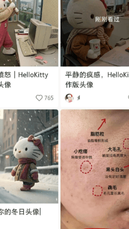 有不少账号就靠发这类Kitty图文笔记,短短一周涨粉就破万;还有很多专门做头像的账号,现在也跟风做起疯感Kitty头像,流量高得离谱,每条笔记的点赞评论都不少。