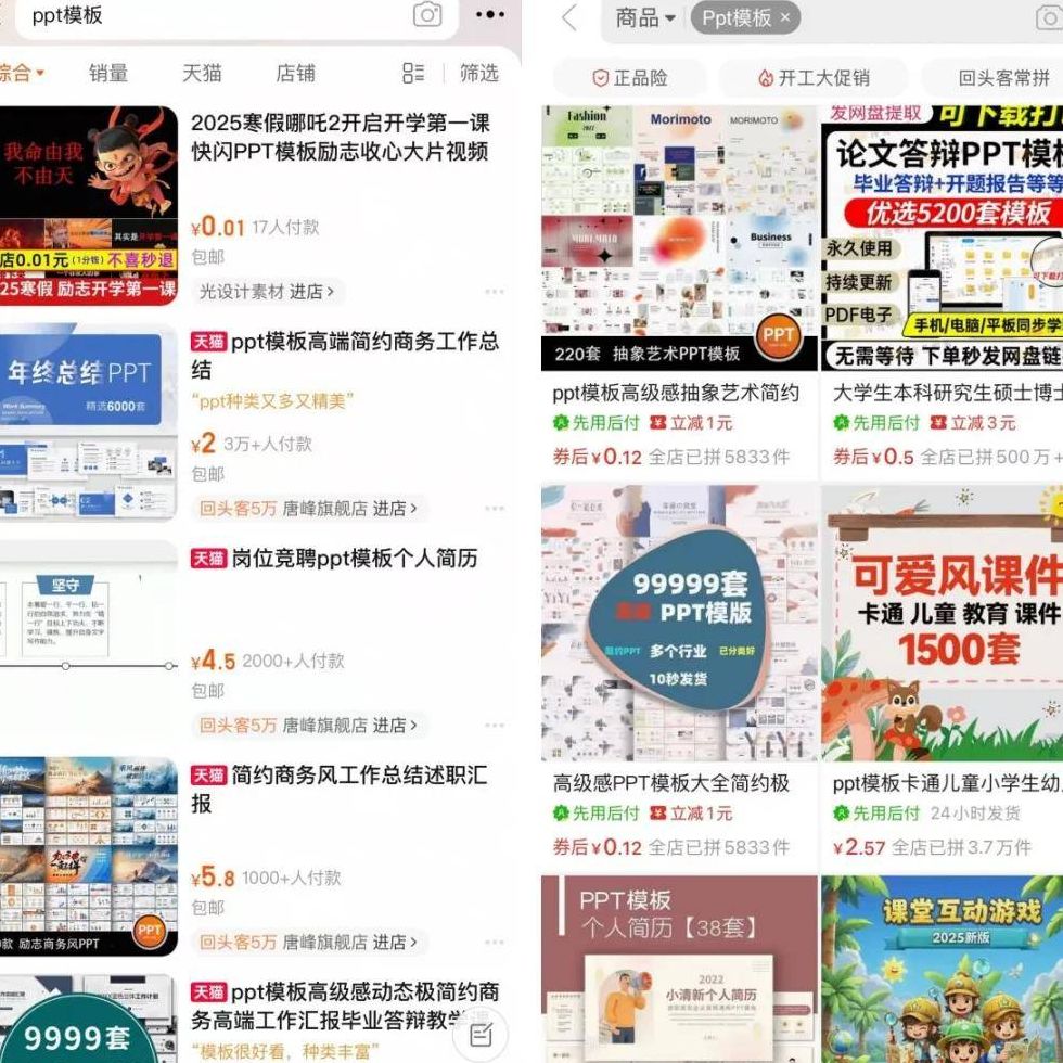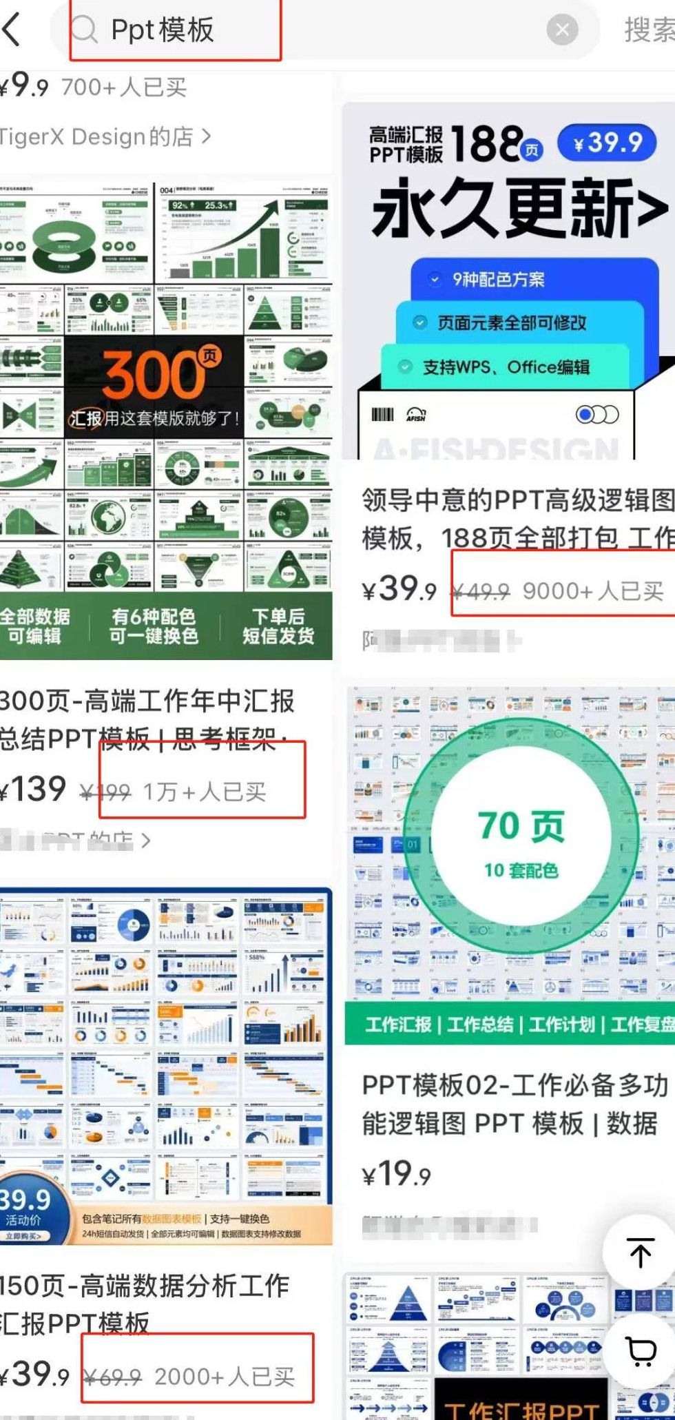 第三步就是找素材,我去淘宝和拼多多搜了一下,几块钱就能买到几千套整理好的PPT模板,算下来这个项目的物料成本几乎可以忽略不计。