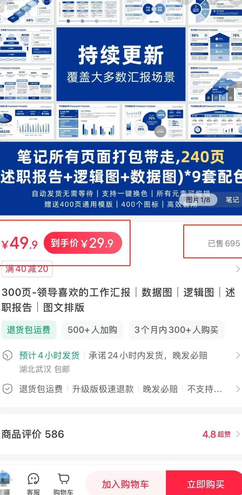 我代入她们的处境想了想:本身日常工作就已经够忙了,还经常要赶企划、做宣传PPT,本来时间就不够用,根本不可能从零打磨一份高质量的PPT。所以花不到30块钱买几百套现成模板,妥妥就是花钱买时间的高性价比选择,没人会拒绝。