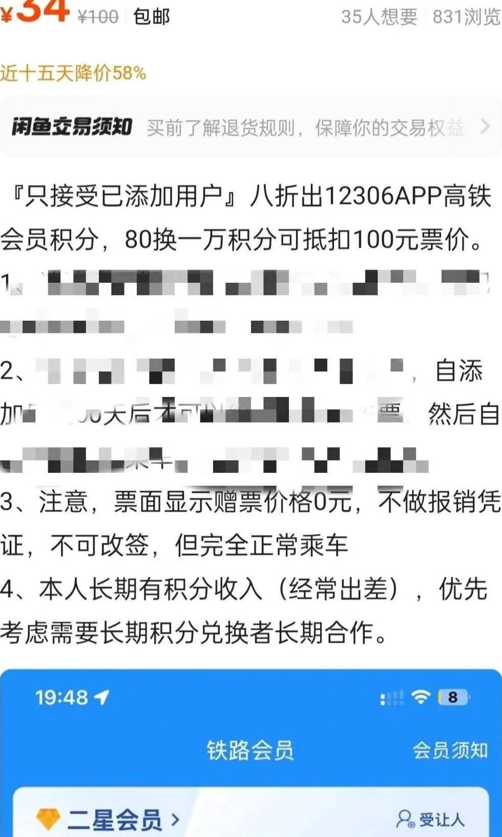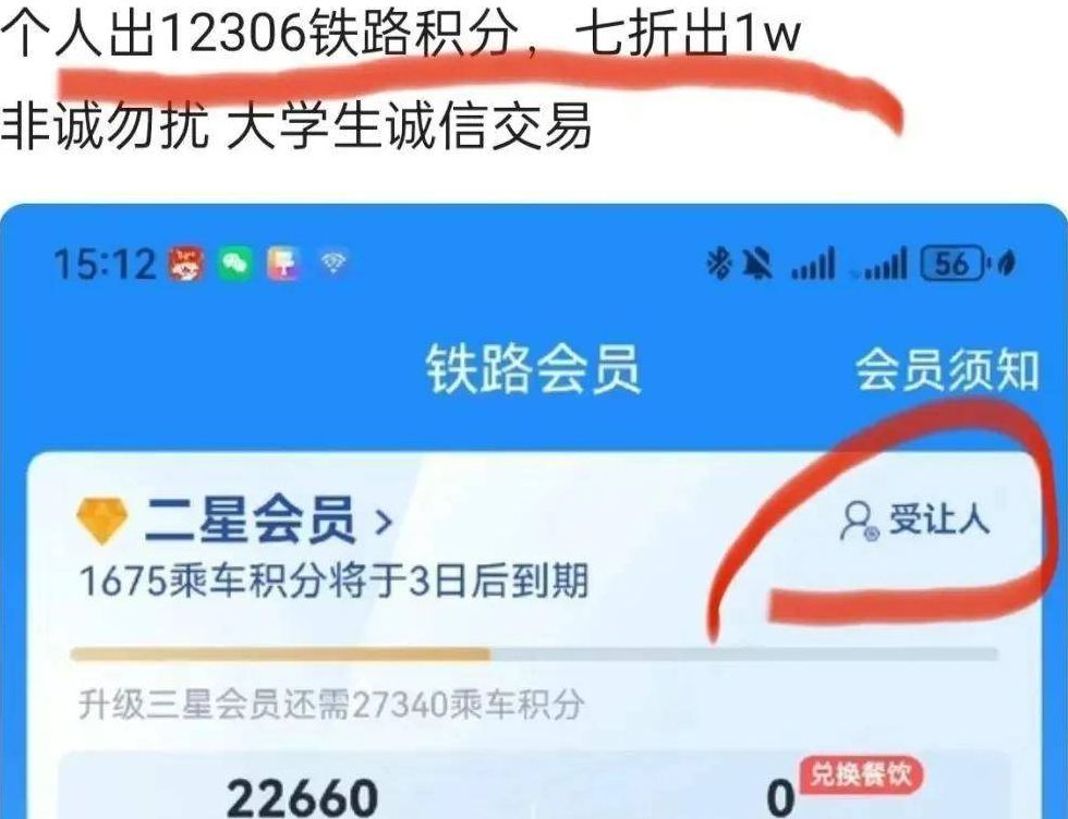 - 在闲鱼、百度贴吧等平台搜索「12306积分 出售」,专门筛选那些标注「七折出」「急出」的卖家(比如手头积分快到期的人、急需变现的学生党,往往会低价抛售),通常1万积分70元就能拿下。