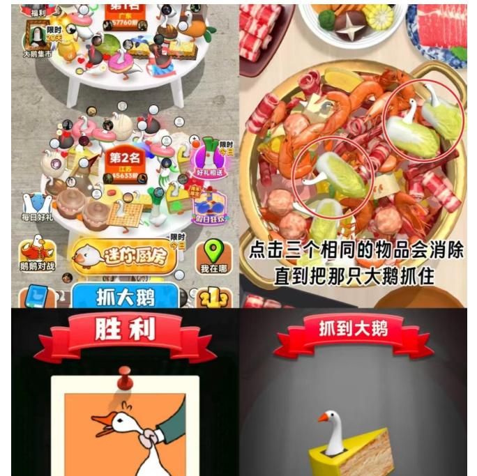 《抓大鹅》是一款休闲益智类小游戏,玩法十分简单,只需找到三个相同的物品就能完成消除。这款游戏的趣味之处在于,第一关轻松无压力,但从第二关开始难度会直线飙升,很容易勾起玩家的胜负欲。
