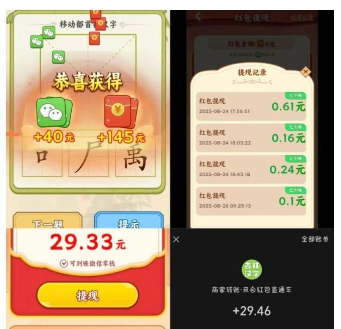 《吉祥汉字》的收益支持按比例提现,不过前期提现额度相对较低,实际能到账的收益不算太高;如果单次提现超过10元,审核速度会慢一些。所以玩这款游戏的时候,建议不要把收益都攒着,记得及时分批提现。