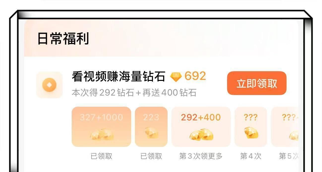 ①:看短剧赚钻石:这个任务的核心策略是领完所有钻石,千万别留结余,一旦有剩余,第二天的钻石收益就会减少。(冷知识:这个任务只需放在一旁自动播放即可)