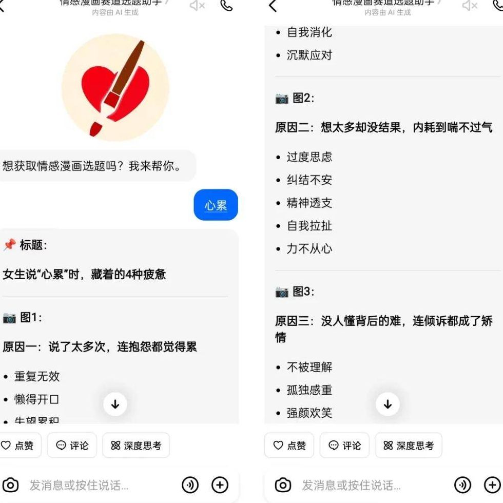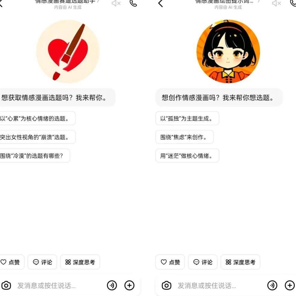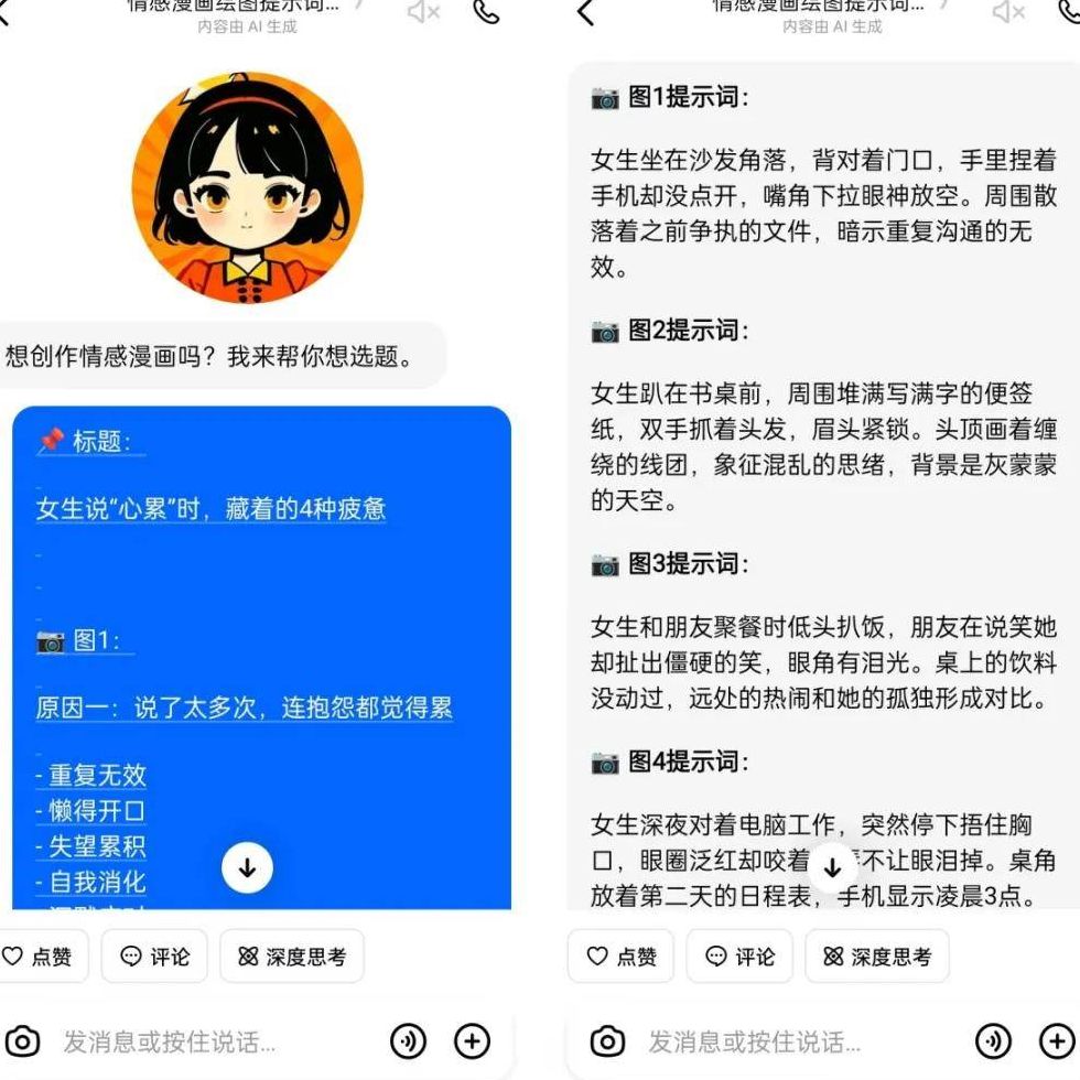 为了省去反复输入提示词的麻烦,我找到了两款免费的豆包智能体工具:一个用来生成选题,另一个专门用来生成绘画提示词。