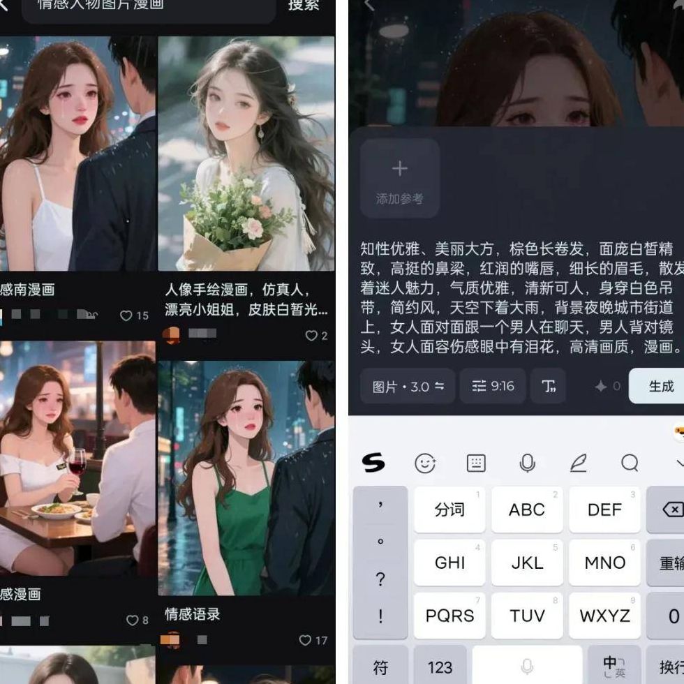 我的解决办法是:在即梦APP底部点击「灵感」栏目,搜索「情感」关键词,就能看到很多用户分享的优质AI形象作品。我直接点击「做同款」,先获取他们的提示词模板,再结合我之前生成的内容进行适当调整。
