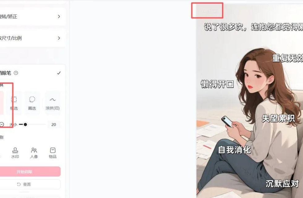 这里还有个小细节:生成的图片左上角带有AI标识。我试着用了美图秀秀的抹除功能,发现可以轻松把它去掉,具体操作看下面这张图:
