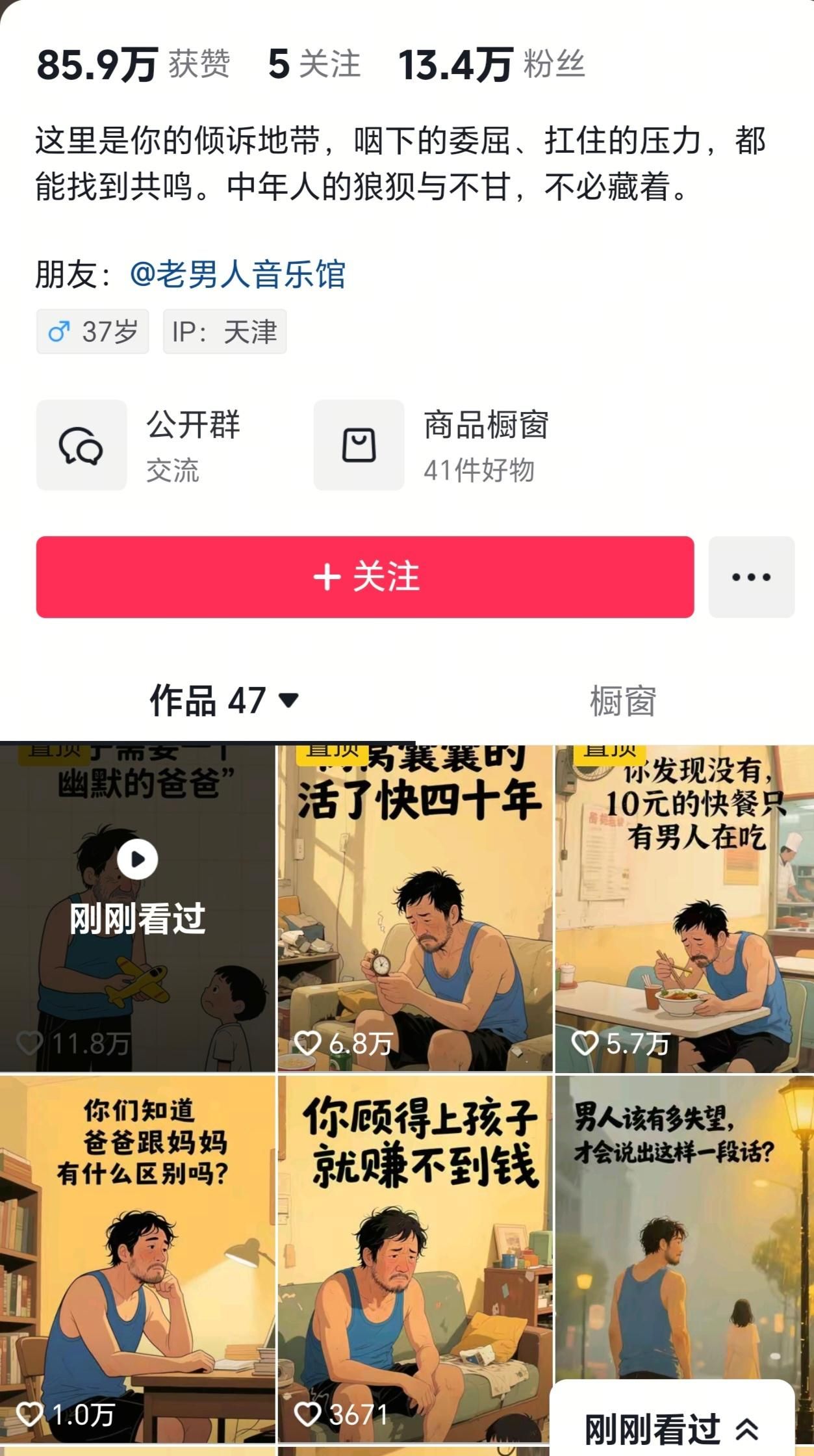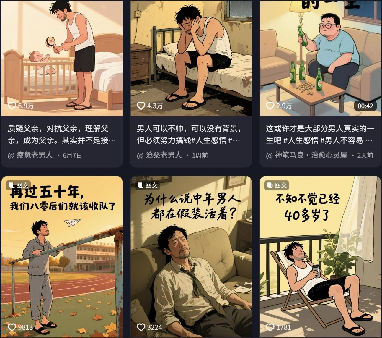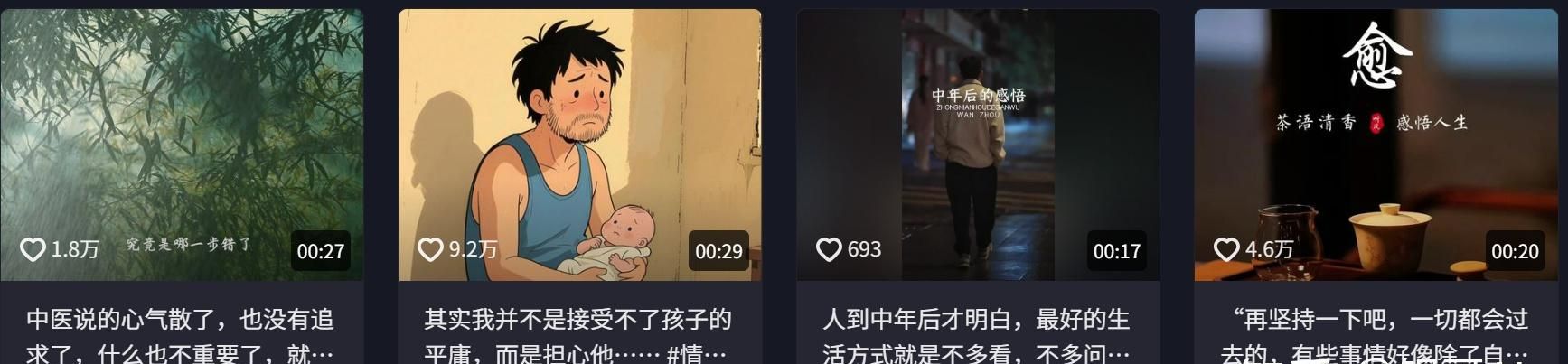 最近在抖音上刷到一个播放数据表现亮眼的AI热门玩法——“老男人生活感悟”类型的视频。
