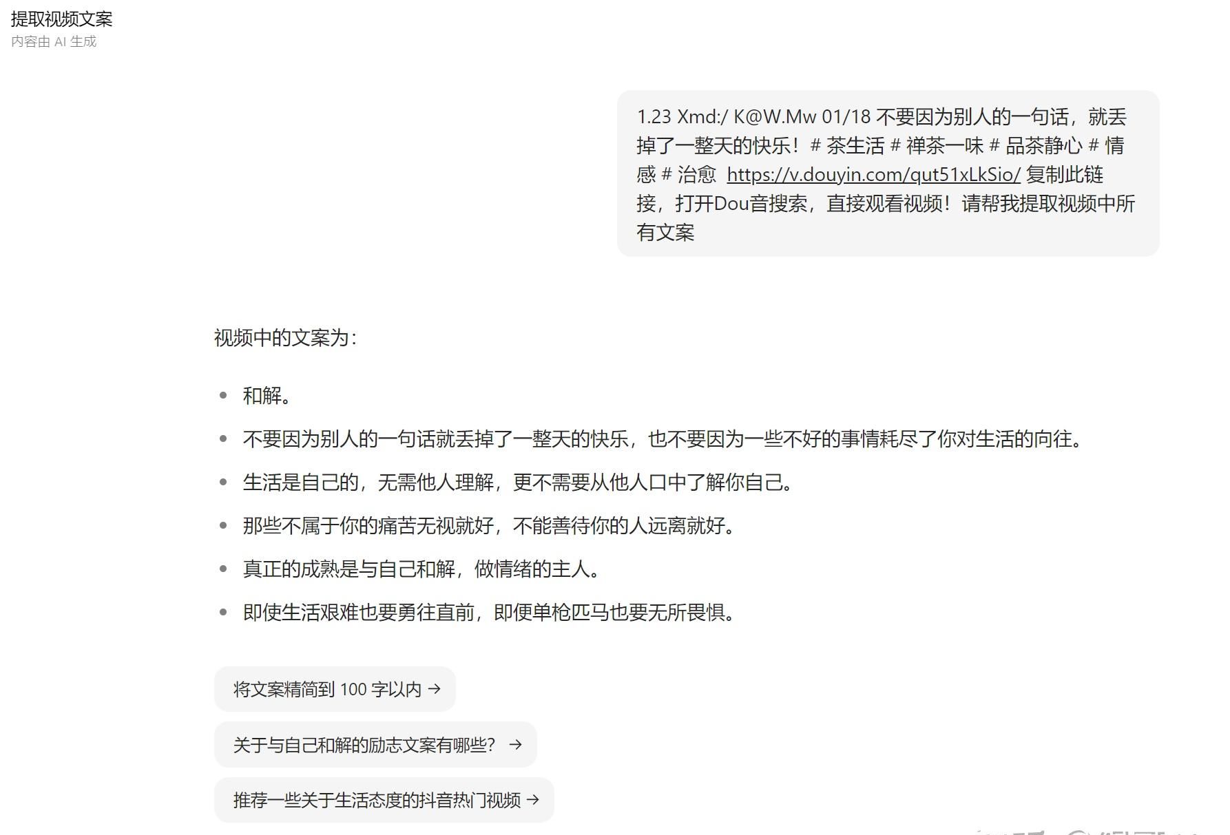 将复制的作品链接发送至豆包,并附上指令【帮我提取出视频中的所有文字】,即可完成文案提取。