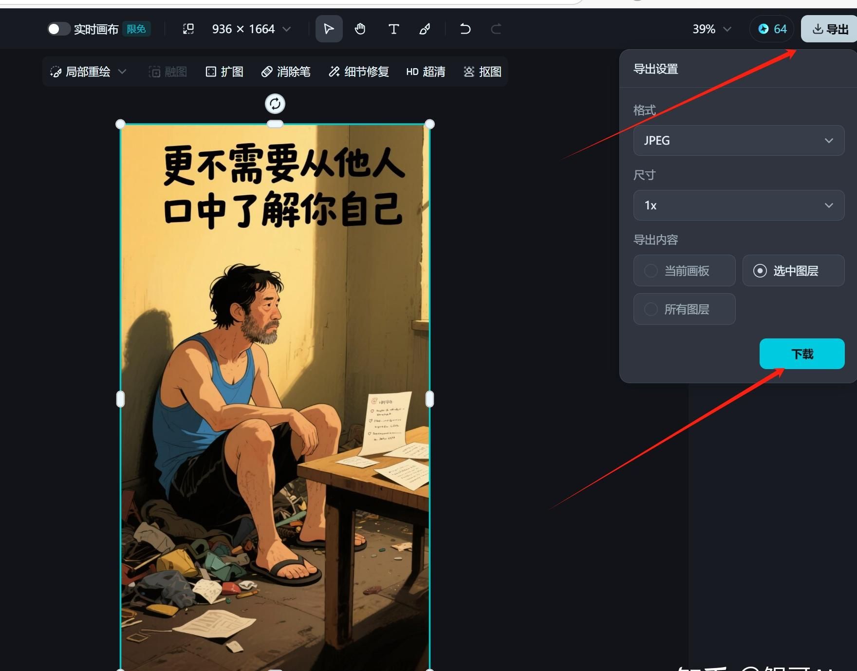 依次输入文案内容,生成图片后选择所需图片,切换至超清模式,进入画布编辑界面,点击【下载】即可下载无水印图片。