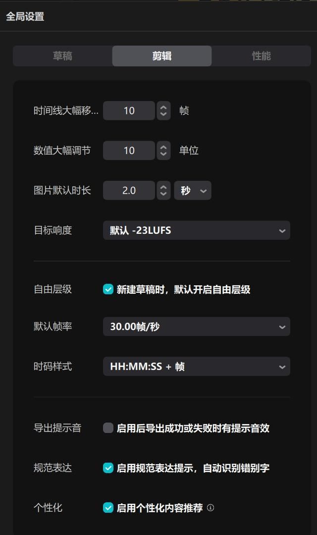 打开剪映,点击左上角【全局设置】,进入【剪辑】设置,将图片默认时长调整为2秒,保存配置。