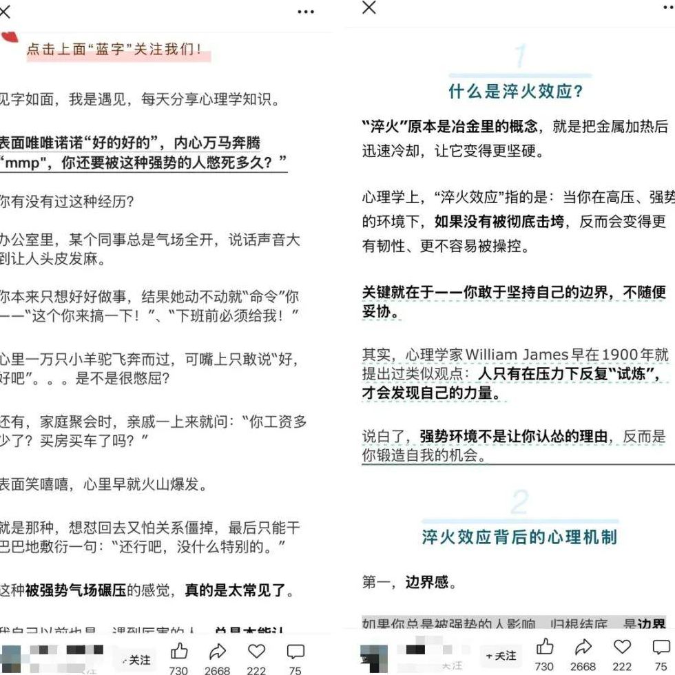 从这些文章熟悉的叙事风格中,我一眼就看出来,创作者并非完全从零开始原创,而是从抖音上的爆款心理学视频里汲取创作灵感,再进行适合图文载体的二次改编。这种跨平台的内容迁移与重塑,不得不说是一种极具巧思的创作策略。