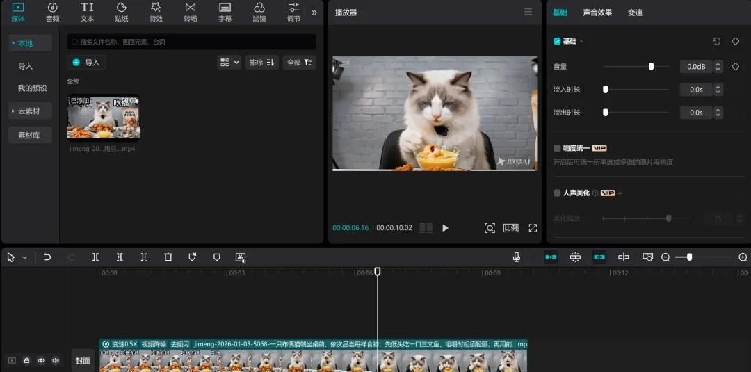 打开剪映,分别上传AI生成好的视频和配音音频。