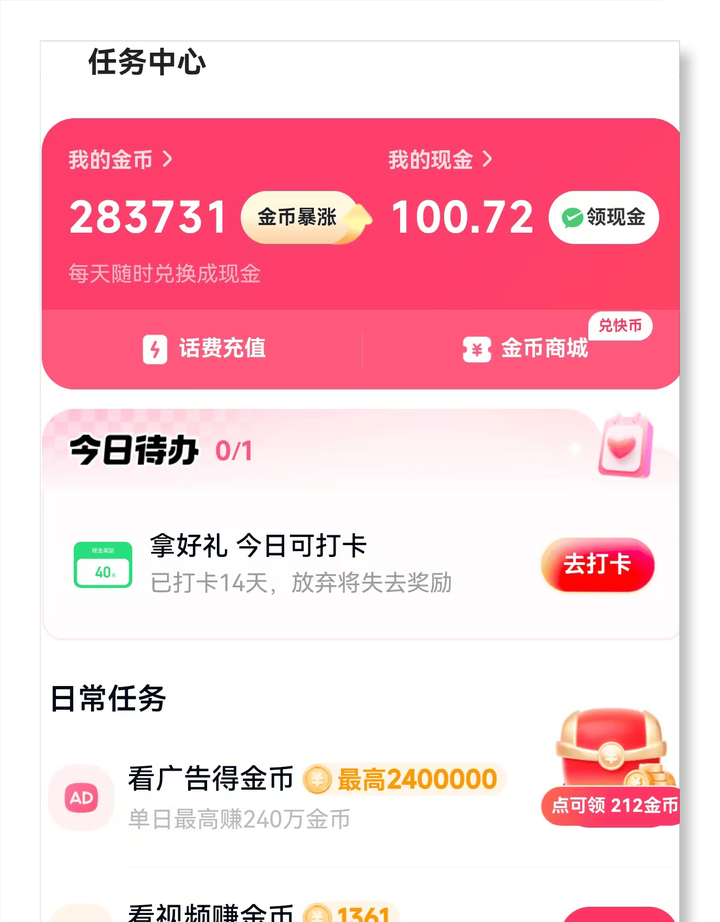 说到看广告赚收益最好的平台,自然少不了抖音极速版,它算是目前知名度很高的看广告赚收益平台,只要认真用对方法,一天赚20-30万金币是完全有可能的,前提是需要养好账号、掌握平台技巧,不然过了新手期之后,就只能拿到少量的金币奖励了。(抖音极速版金币兑换比例为10000:1)
