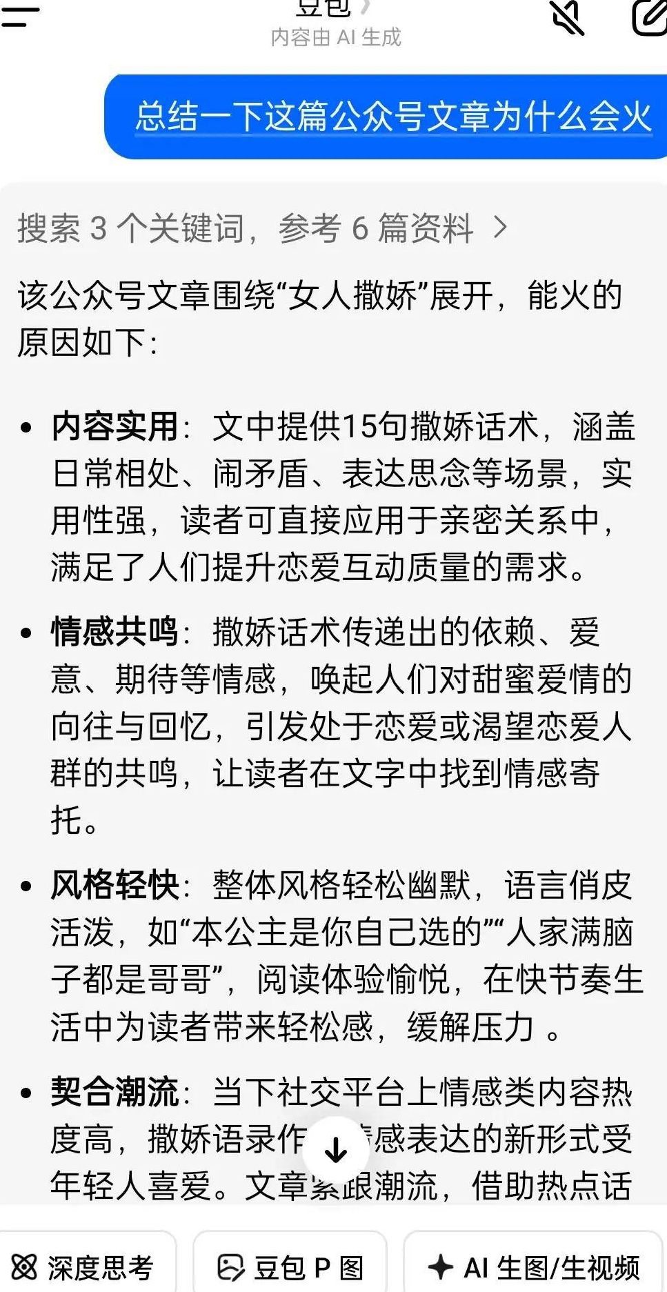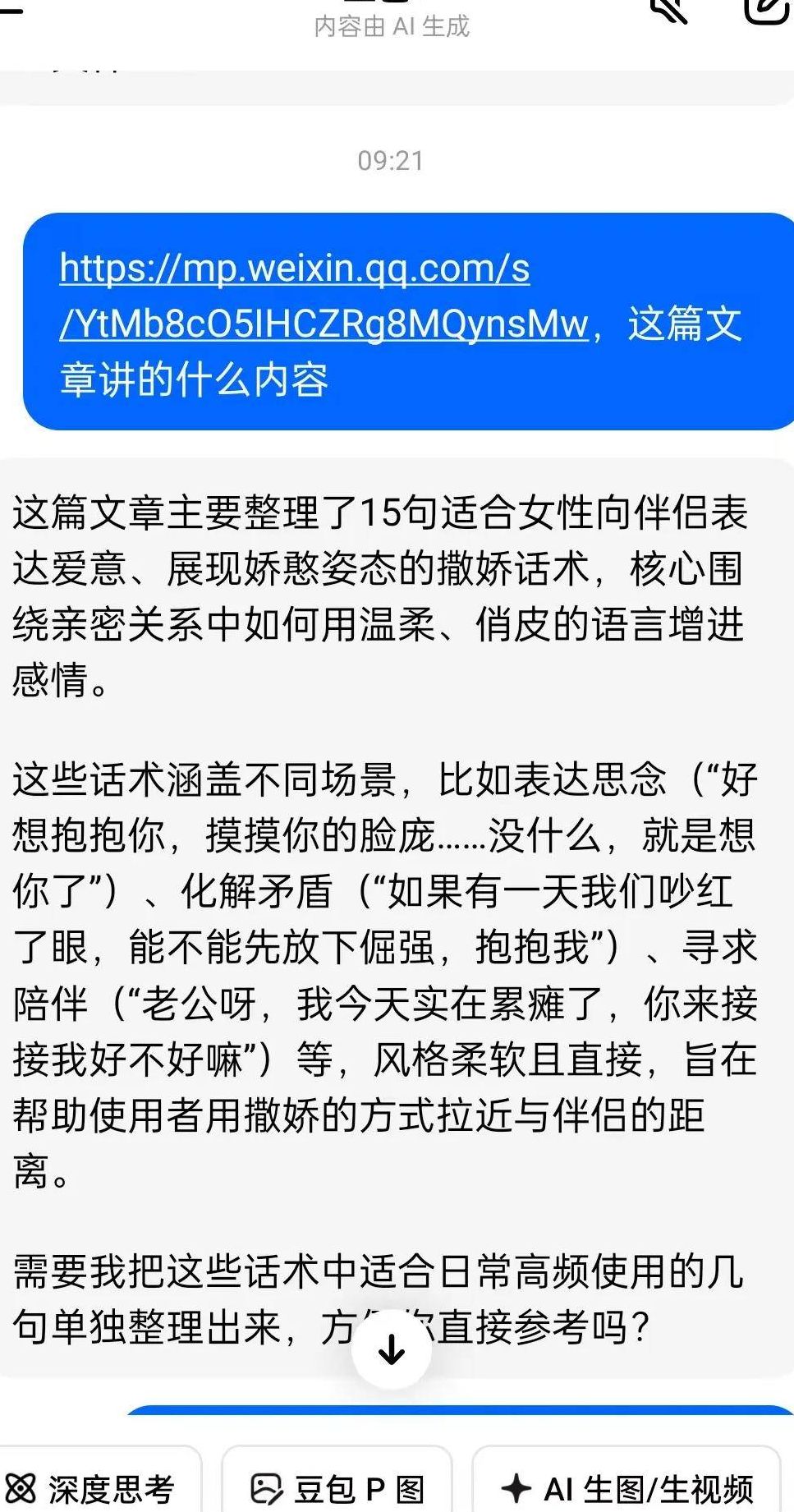 内容由“文案”和“图像”两个核心组件组成。对于文案组件,如果缺乏原创能力,可以借助AI工具进行标准化生产。我们以豆包APP为例演示流程:第一步,找到一篇对标爆款文章,复制其链接。