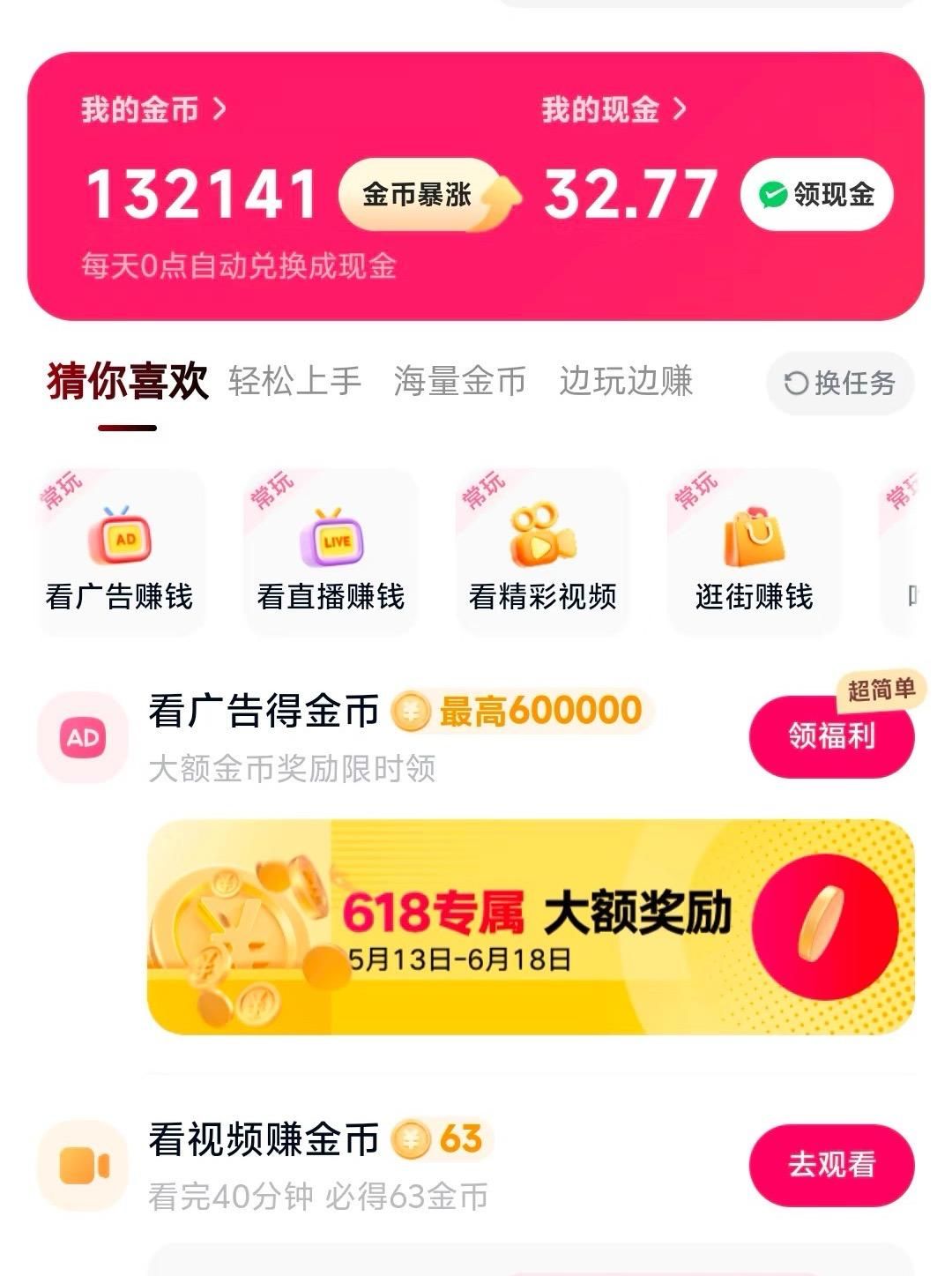 在抖音极速版有多种轻量赚钱玩法,完成日常任务、签到、邀请老用户回归都可以获得金币,金币积累到一定额度就能兑换成现金提现。