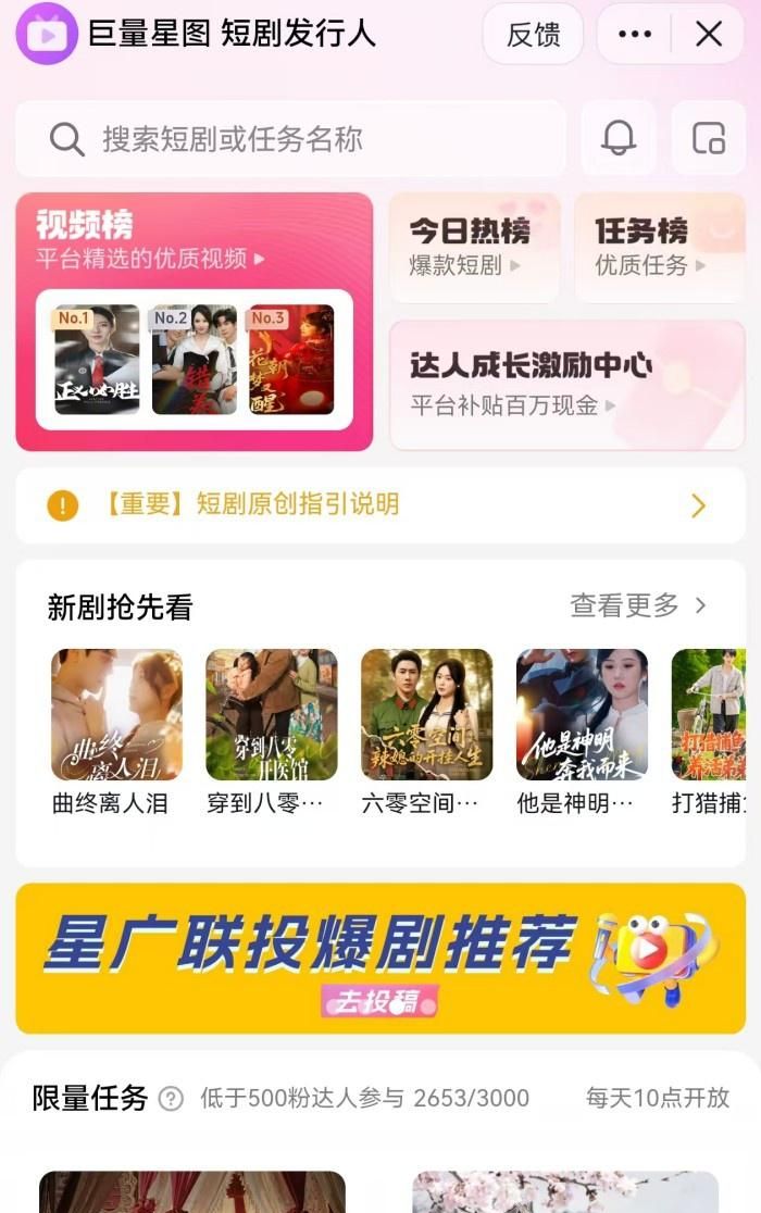 抖音:在抖音搜索“巨量星图”,选择达人身份,然后进入短剧频道即可挑选短剧。但需满足账号粉丝量超过1000或低于500。