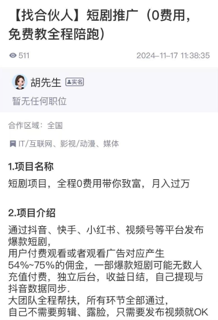 操作简单:部分项目方还会配套提供教程服务,真正让新手小白也能轻松上手剪辑出片,赚取可观的短剧推广收益。
