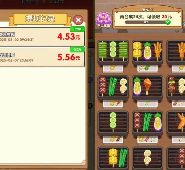 3)我的小吃摊:采用的是经营模拟玩法。收益逻辑也很清晰:用户行为(比如卖小吃)产生虚拟收益 → 摊位升级 → 提现比例提升。简单说就是,你的小吃销量直接决定最终收益规模。
