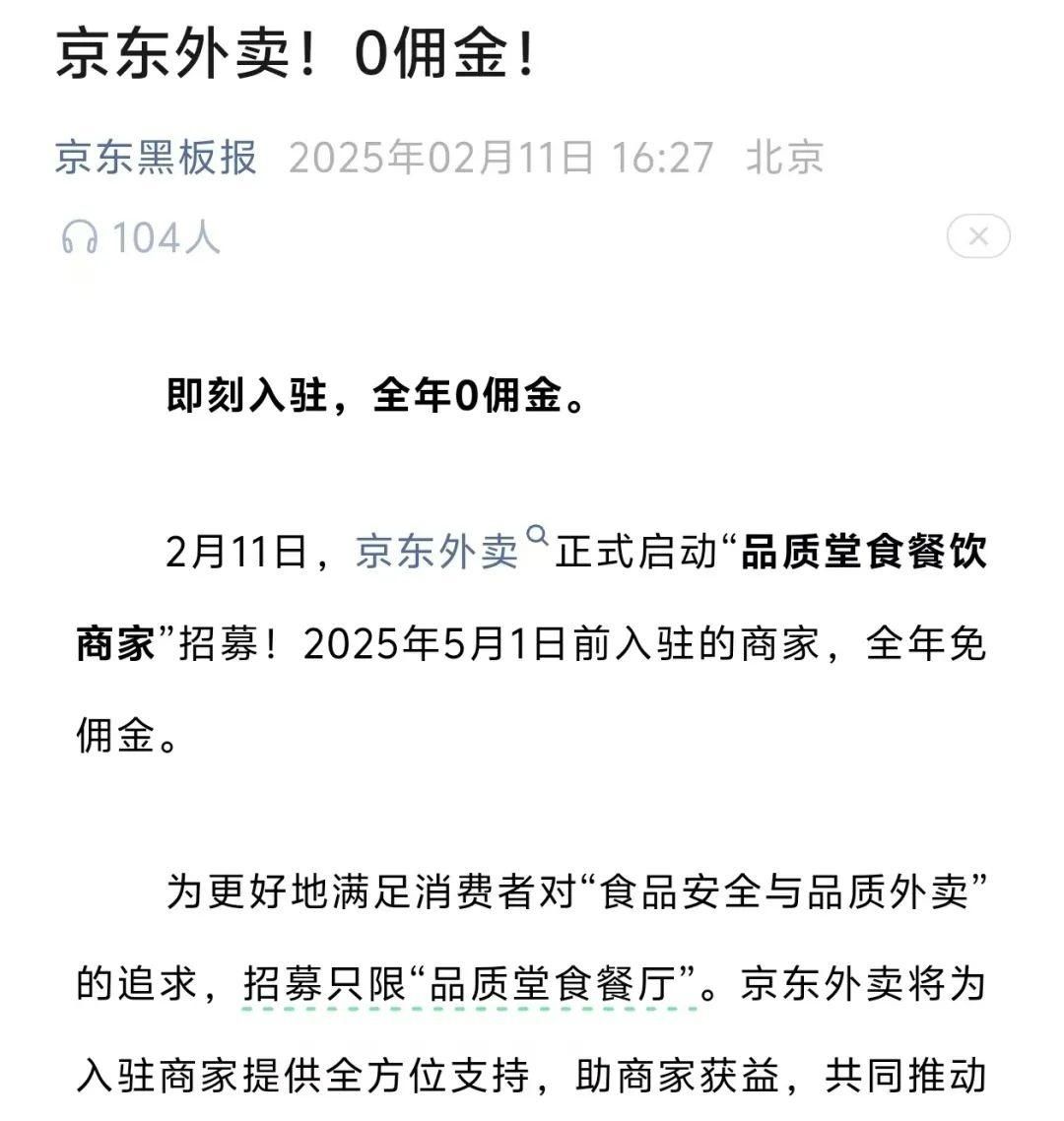 与此同时,京东在社交平台抛出一则重磅消息:“2025年5月1日前入驻京东外卖的商家,全年免佣金。”